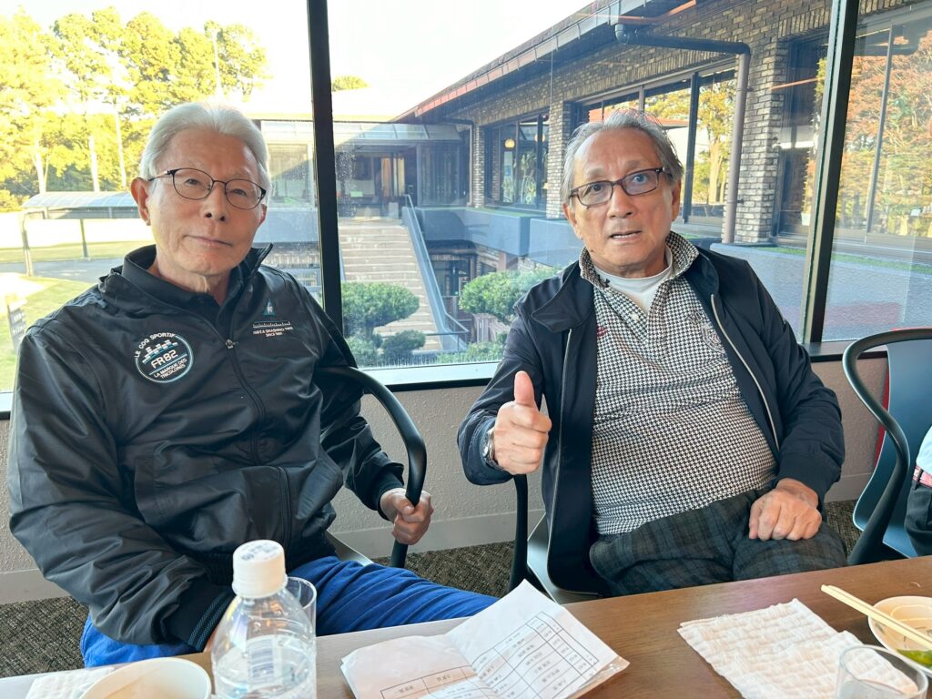 開会式では、橋口キャプテンよりご挨拶と初参加者(小山先輩、赤坂先輩)のご紹介をいただき、プレーでは、鬼塚総監督の優勝、深野先輩の抜群の安定感、そして、今年3月からゴルフを始められたばかりの赤坂先輩。とある打ち下ろしのホールで、200ヤード級スーパーショットを炸裂!してぃ!